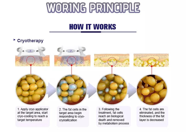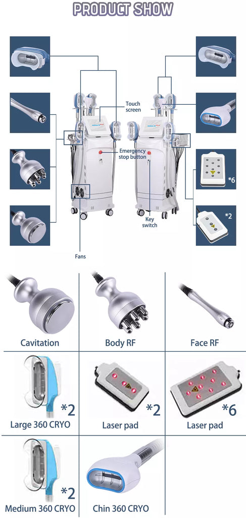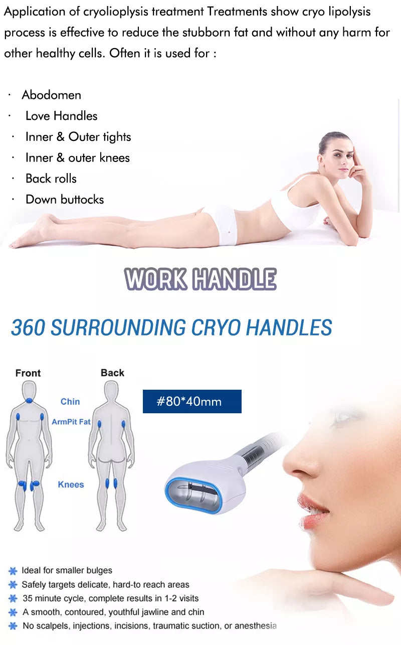 360 cryotherapy is a new, invasive way to reduce fat in target parts of body. It freeze triglyceride(a meterial of fat), which will freeing, coagulation in specific low temperature. 360 surround cooling technology is unlike the conventional two sided cooling method, The 360 applicator relies on "all-round cooling" instead of the traditional cryo cup "Cooling plates". High conductive cooling surface that works with built-in electroporation energy to offer a unique cooling delivery system which results in firmer skin and even better fat reduction. 360 handle designed with different interchangeable contours to adapt to any area of the body, the handpieces are adapted for areas of curved contours like the back, waist and sub-buttocks, broad areas such as the flanks, love handles and calves, and for fat folds small and large, from the abdomen and back to the arms, knees and under the chin.