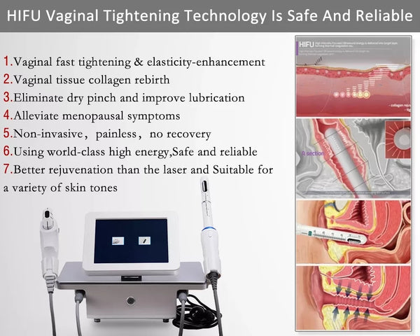 High-intensity focused ultrasound energy (HIFU) gather with a unique high-energy focused ultra-ultrasound to reach the vaginal SMAS layer, lifting the SMAS layer, and comprehensively solve the vaginal relaxation problem. It accurately locates the ultrasonic energy in the submucosal 4.5mm layer. The muscle layer of SMAS is stretched to achieve the best effect of vaginal contraction. It acts on the collagen layer of 3mm under the skin, regenerating the collagen, achieving the elasticity of the skin, and the energy sweeping across the epidermis. All of them do not worry about the mucosal layer injury, and do not worry about the infection caused by the mucosal layer injury!