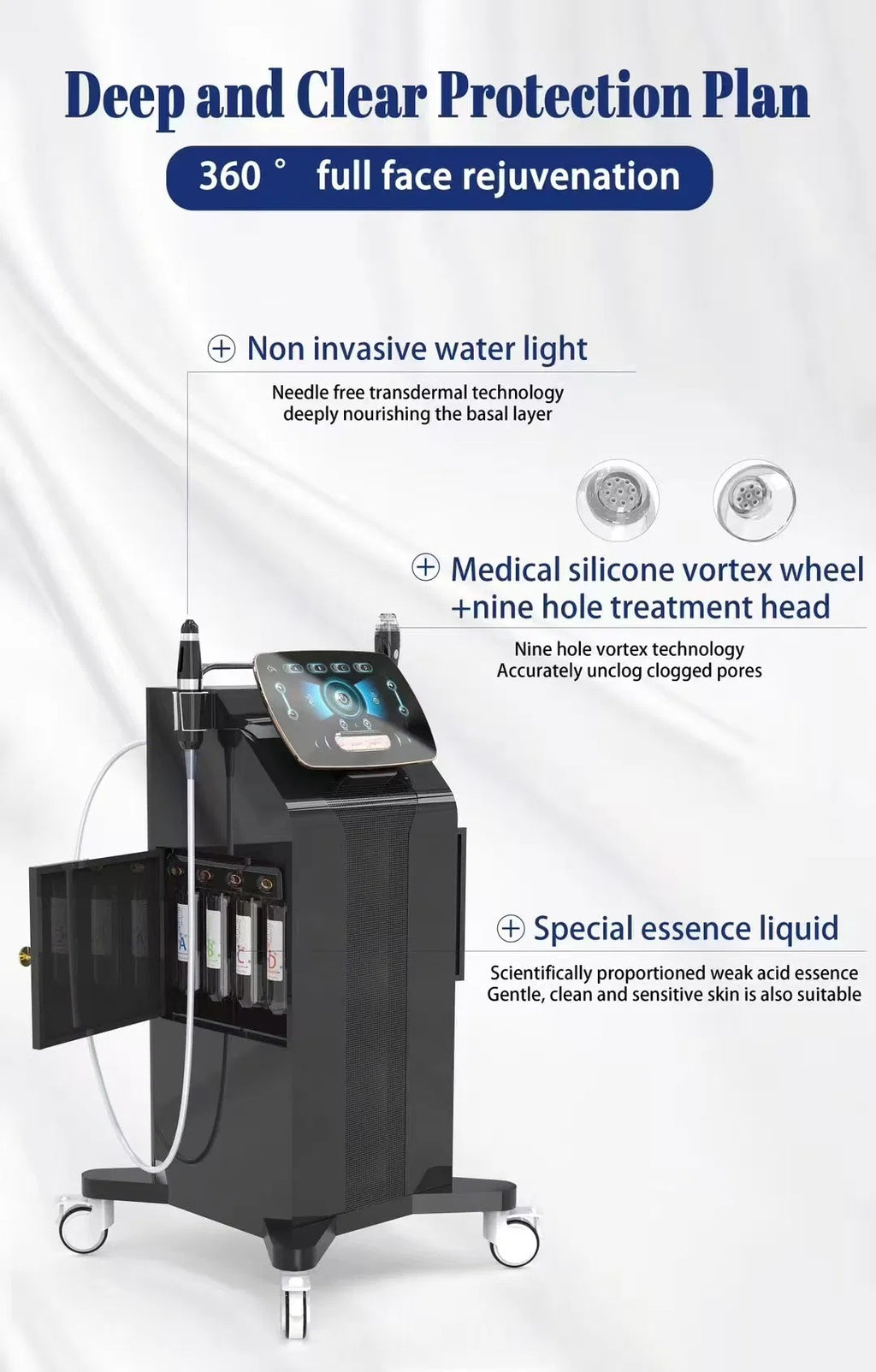 At the same time, its unique negative pressure dual-direction drainage system is a key highlight. This system not only penetrates essential serums, enriched with hyaluronic acid, amino acid surfactants, antioxidants, and other nutrients, into the skin, revitalizing it and quickly replenishing moisture andnutrients, but it also efficiently removes deep-seated impurities from the skin.This ensures a deep and effective cleanse while delivering comprehensive nourishment to the skin, supporting its self-repair and renewal from within. This process helpos to achieve the ideal skin condition, with both internal and external care workirng together.