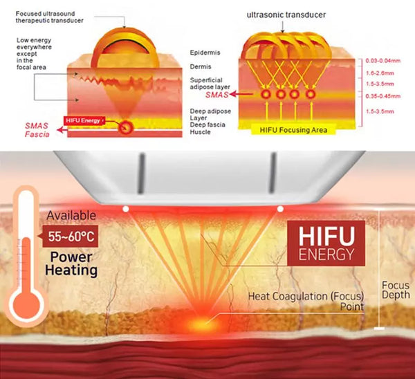 High intensity focused ultrasound is a form of energy that is significantly different than light,such as IPL and Lasers or Electrical (Radio-Frequency) energy. HIFU, protects the skin surface,whilst precisely penetrating at deeper depths and higher temperatures than Radio Frequency,for example, treating beyond the Dermis and Foundation layers, where structural weakening starts.