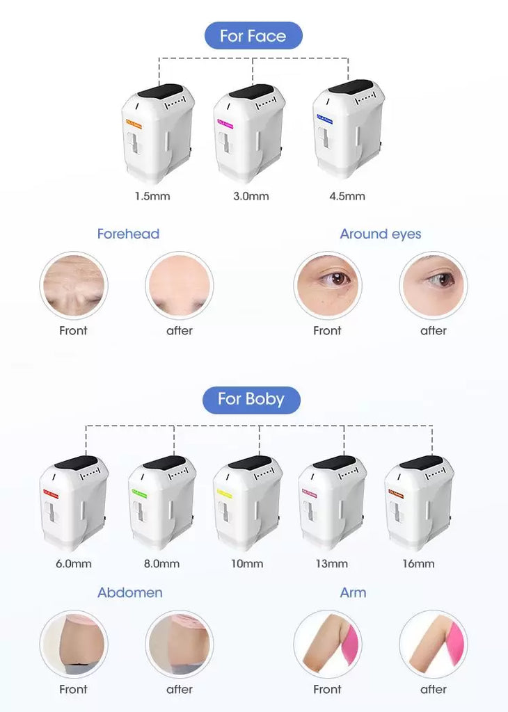 3. Using the most advanced high-tech technology, it is equipped with several hifu cartridges according to the facial skin condition,which accurately affects different depths of skin,and the energy is slightly over the epidermis during treatment, and 100% without any damage.At the same time, the depth of the skin treated by hifu cartridges is consistent with the set value, ensuring the customer's painless and comfortable.