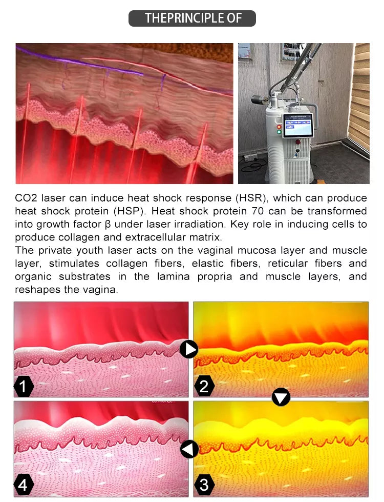 Vaginal tightening laser is the use of water uptake 10600nm gold standard laser, using a three-dimensional lattice technology and 360-degree circular emission perfect combination of technology, to produce 50-70 degrees Celsius in a controlled depth of the vaginal mucosa, stimulate lamina propria and myometrium newborn fibroblasts, and damaged collagen fibers, elastic fibers, such as restructuring, so as to achieve vaginal wall thickening and tighteningof the vagina so that firmness, sensitivity enhancement, vagina tight as ever.