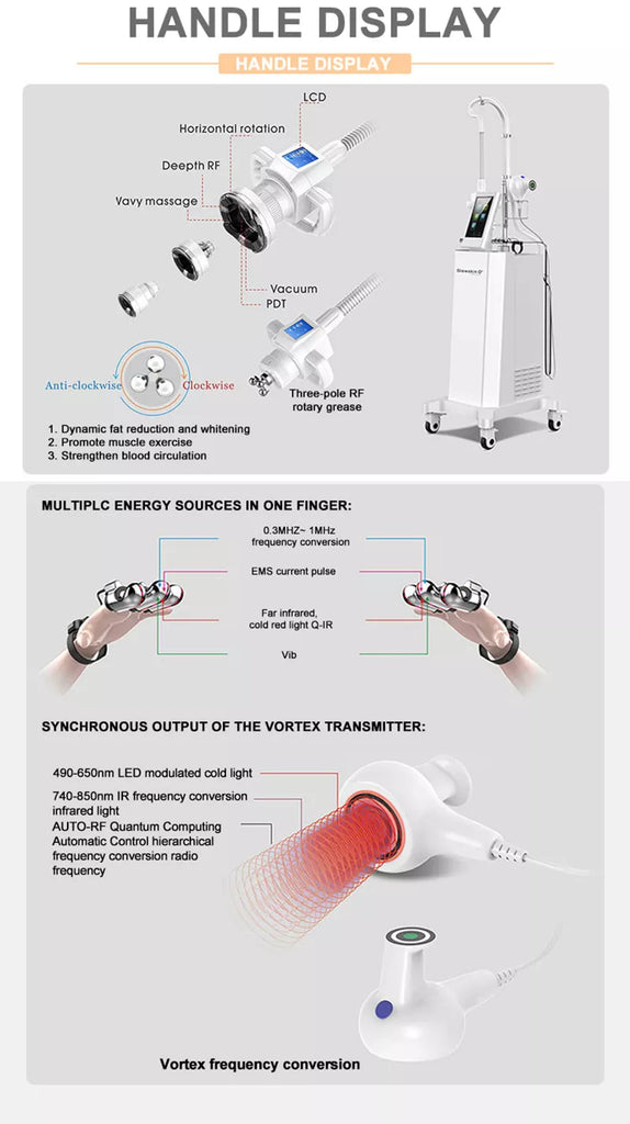 | Technology | Vacuum RF + EMS (Electrical Muscle Stimulation) + IR (Infrared) + PDT (Photodynamic Therapy) |