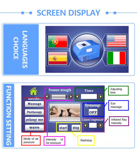 Equipped with five air bags for arm, abdomen, thighs, bootee, this air vibrant massager functions effectively in inner circulation improving and body relaxing. Controlled by intelligent system, ideal treating programs are available for you to choose. Different working time, pressure, treating parts and modes are available for you to adjust.
