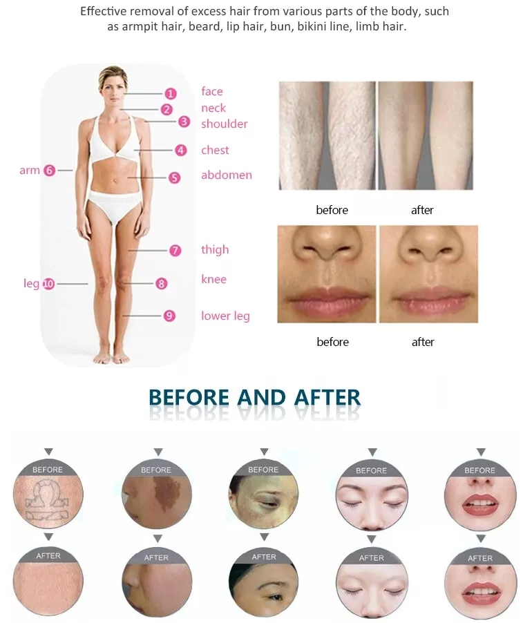 5) Hair removal and Skin rejuvenation Features 1.The latest mobile phototherapy operating technology, fast and efficient. 2.The latest single pulse technology, no pain, easy and comfortable hair removal. 3.Plug-and-play plug-in connector, water and electricity separation design, safer, easier installation. 4.Water flow, water temperature self-check system, self-correction system to ensure the safe operation of the machine. 5.The unique shape design and color match make the product more beautiful and fashionable.