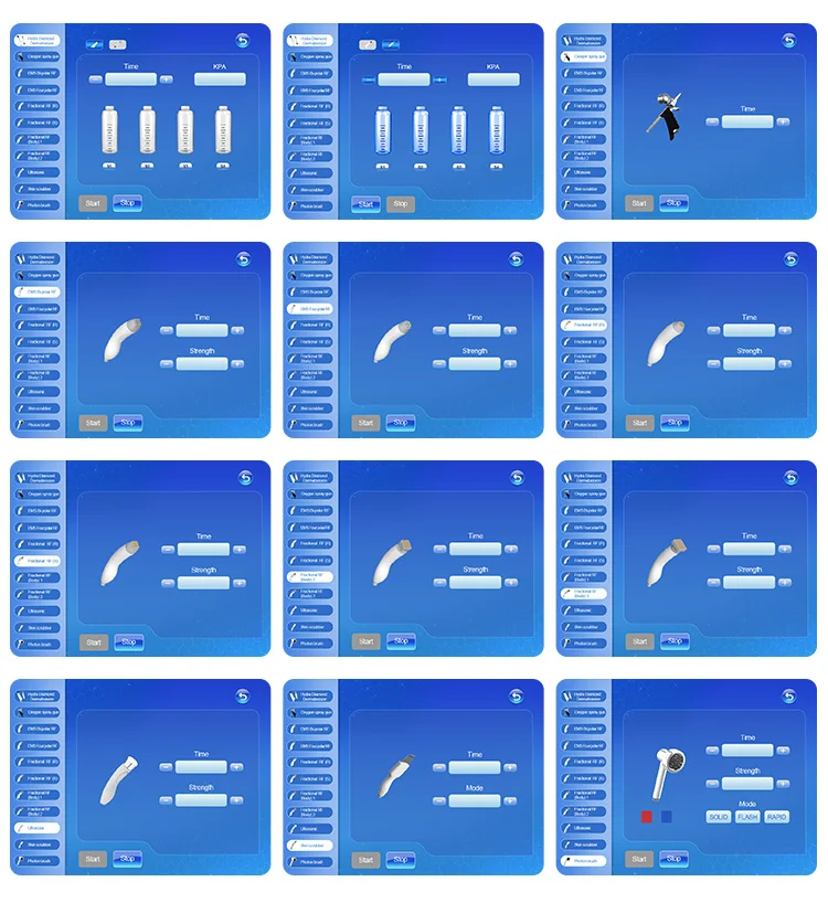 | Handles & Tips | - Hydrodermabrasion: 8 tips - Diamond dermabrasion: 9 diamond tips - EMS Bi-polar RF: 1 piece - EMS Four polar RF: 1 piece - Fractional RF Handles: 4 pieces - Ultrasound: 1 piece - Skin Scrubber: 1 piece - Oxygen Spray Gun: 1 piece - Photon Brush: 2 pieces |