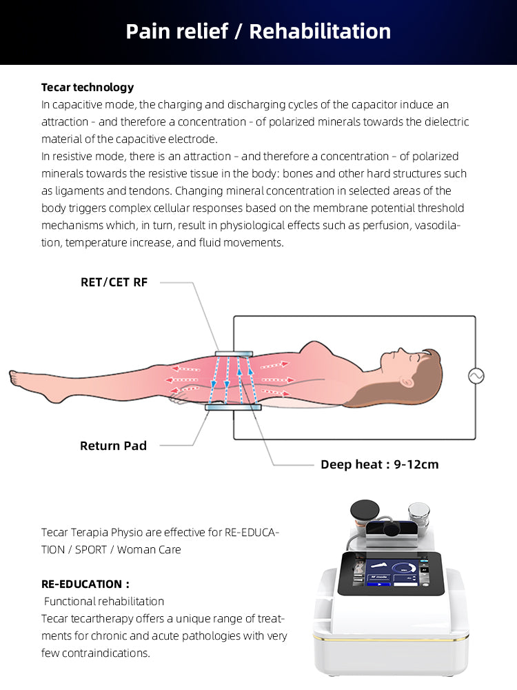 RET (Resistive Electric Transfer) Targeted Radiofrequency Diathermy Therapy Device works deeper targeted tissue than current superficial diathermy therapy devices.lt transfers high frequency electromagnetic energy through the tissues of the body creating selective tissue hyperthermyit can decompose body fatty cell so as to loss weight