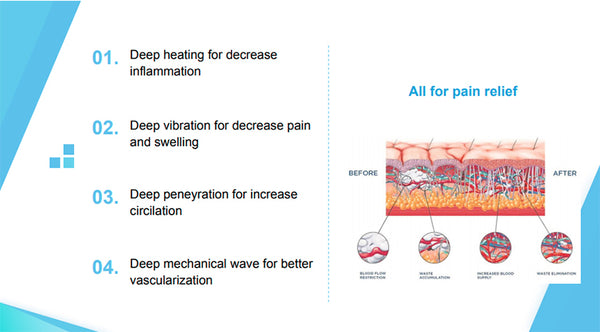 The sound waves creates microscopic stimulation in the deep tissue molecules that increases heat and friction. The warming effect encourages and promotes healing in the soft tissues by increasing the metabolism at the level of the tissue cells.