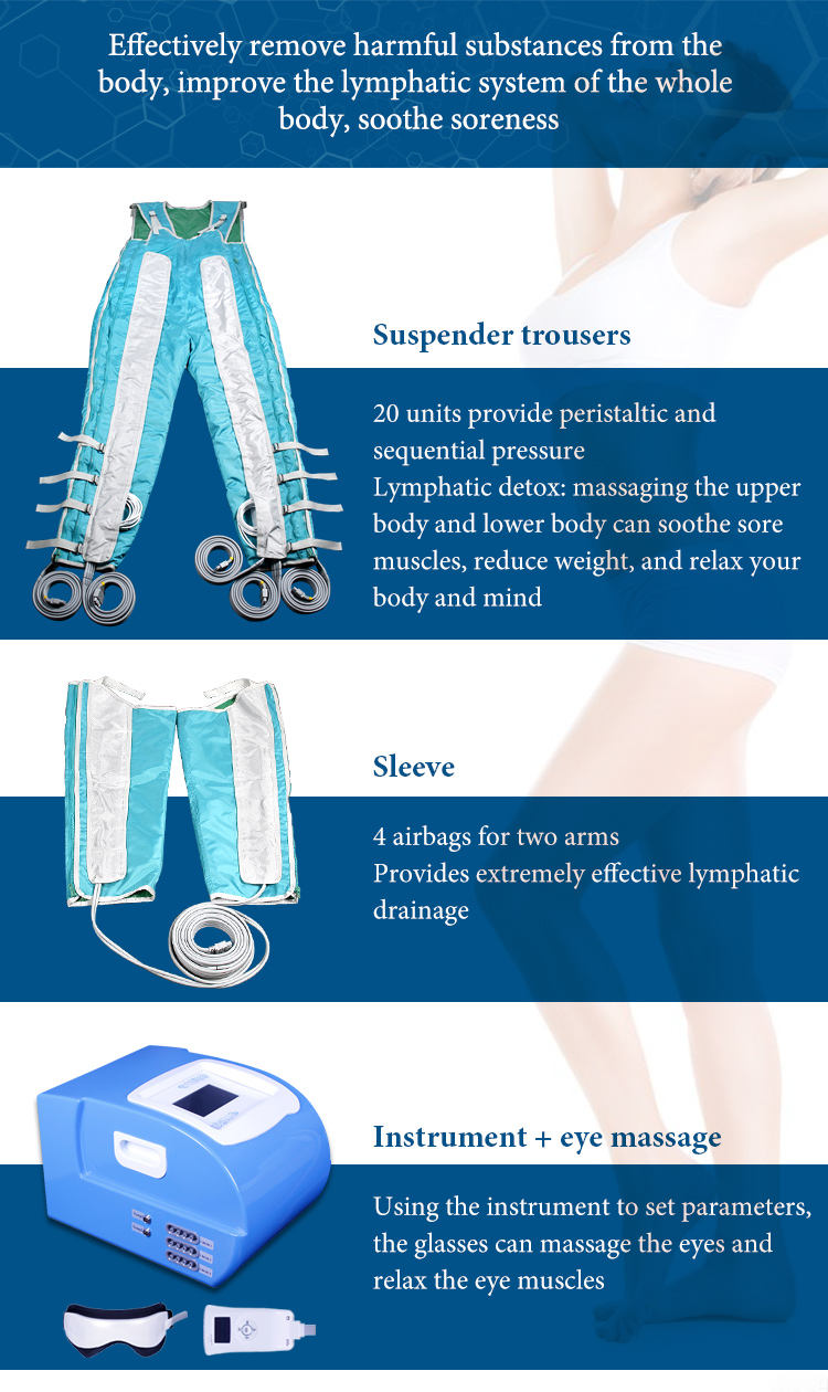 The lymphatic detoxification slimming machine is known as the human body "scavenger", mainly within the circulatory system of the human body. The inner recycle including: the blood circulatory system, the lymphatic circulatory system and tissue fluid, etc. The air inflation by the air bag tie customers’ abdomen, arms, legs lymphatic at inflated circulation to a certain period of time and deflated, prompting within the circulatory system to speed up the cycle in the human body, in order to achieve detoxification slimming, endocrine regulation.