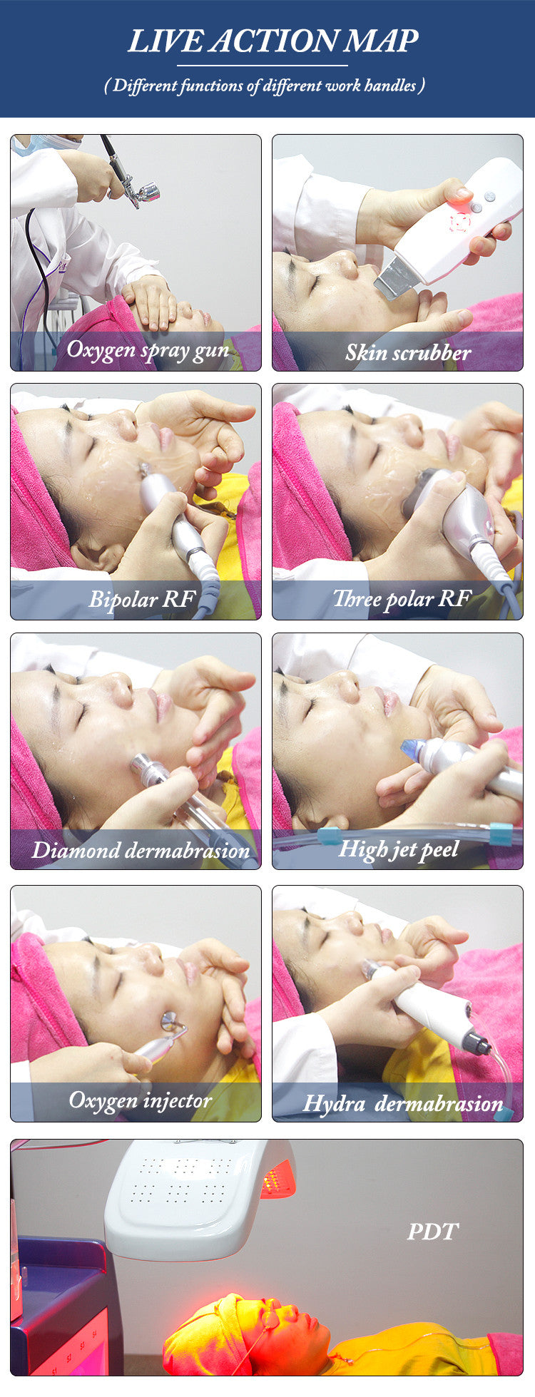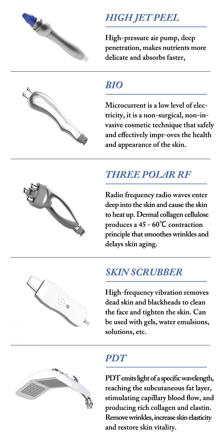 | Technology | Hydrodermabrasion/ Spray mistgun/ BIO/ RF/ Oxygen jet peel/ PDT |