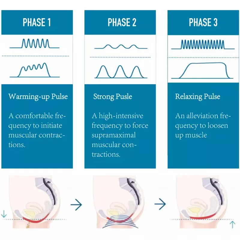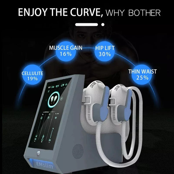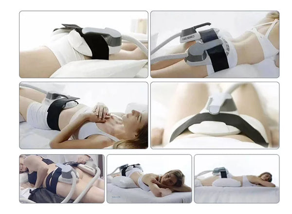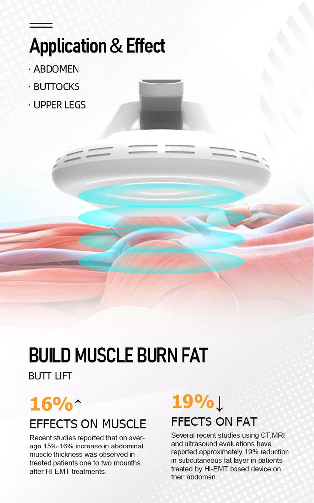 By using HI-EMT( high energy focused electromagnetic wave) technology to expand and contract muscles, limit training, and deep remodeling of muscle internal structure, That is, the growth of myofibrils (muscle enlargement) and the production of new protein chains and muscle fibers (muscle hyperplasia) to train and increase muscle density and volume. HI-EMT 100% limit muscle contraction of the technology can lead to a large amount of fat decomposition, fatty acids from the decomposition of triglyceride outflow, a large amount of accumulation in adipocytes. Fat acidity is too high, fat cells apoptosis, in a few weeks by the body's normal metabolism out of the body.