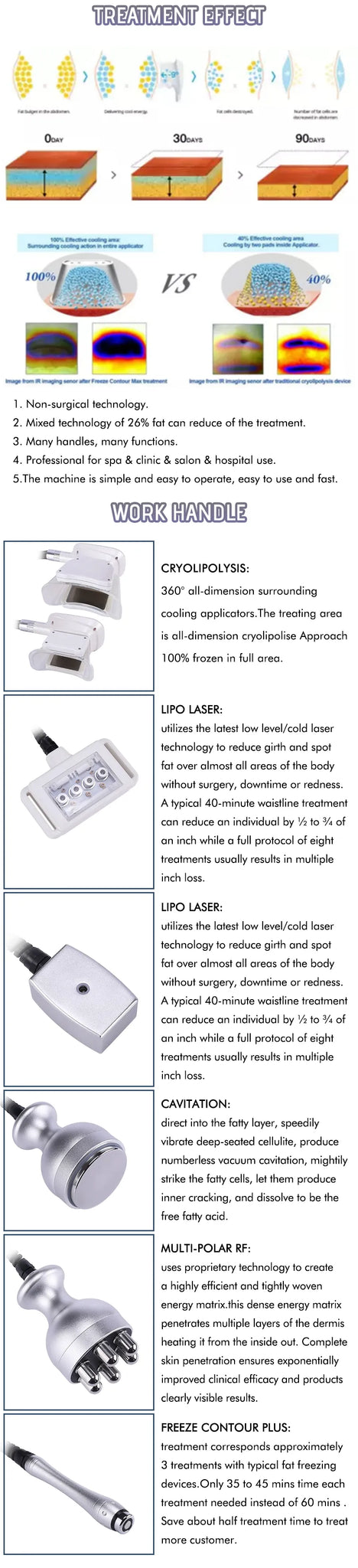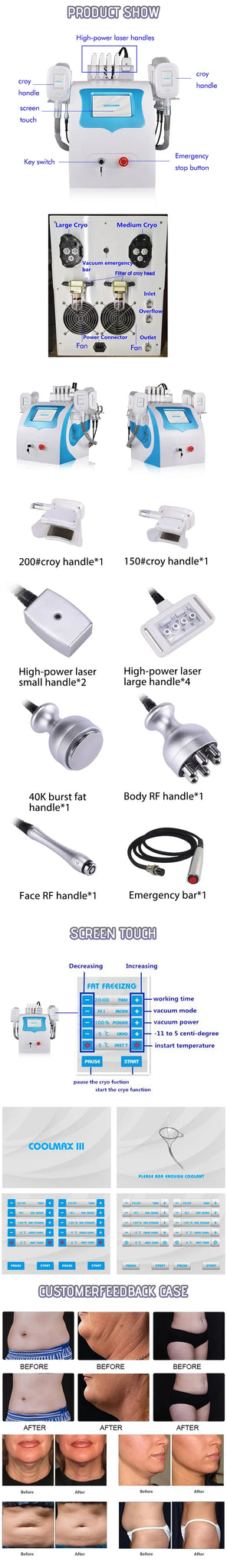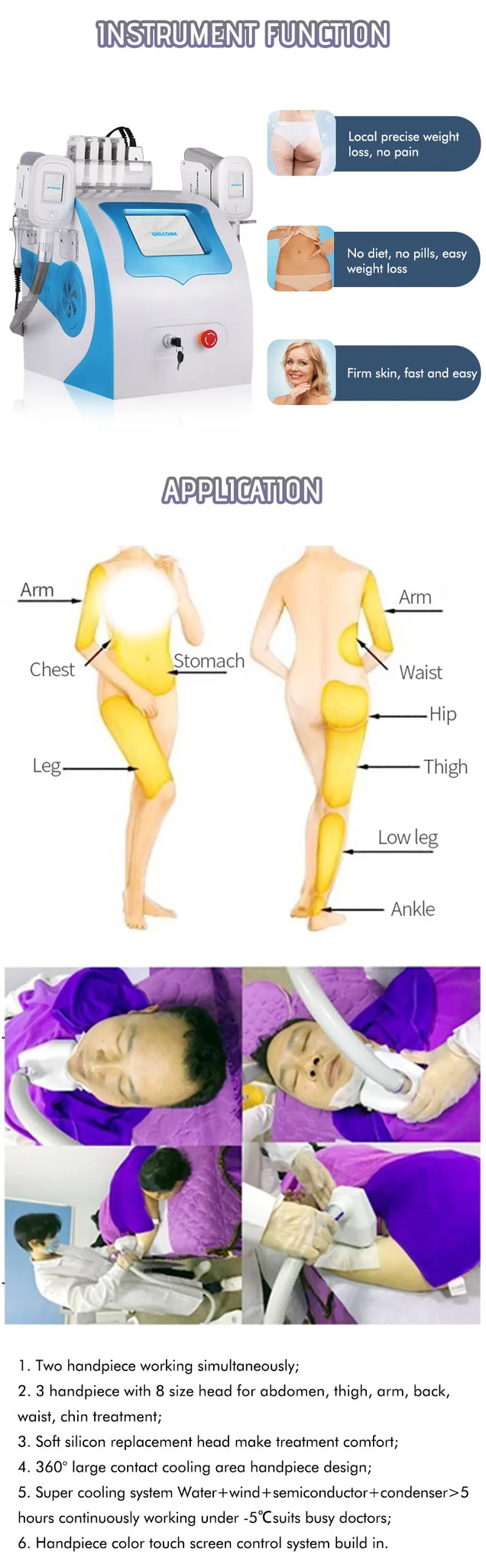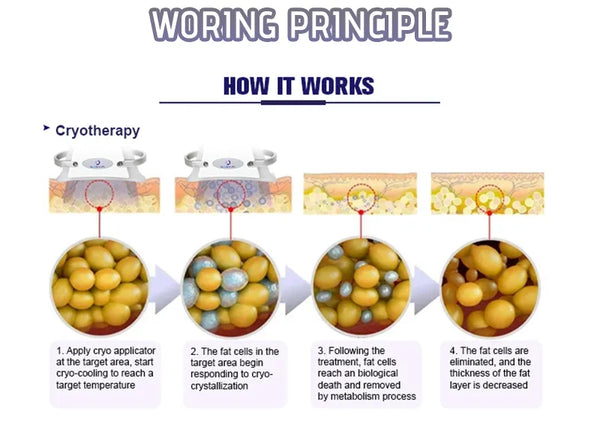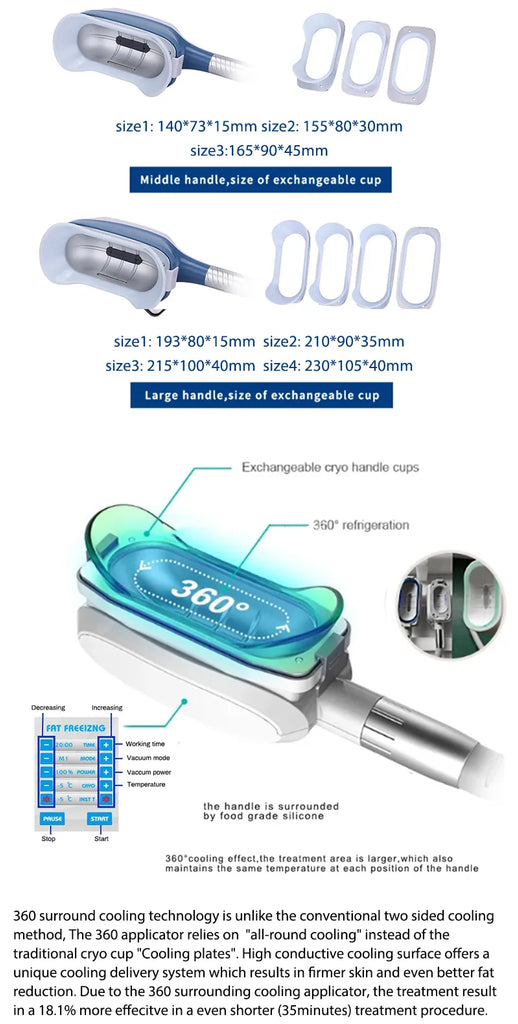 360 cryotherapy is a new, invasive way to reduce fat in target parts of body. It freeze triglyceride(a meterial of fat), which will freeing, coagulation in specific low temperature. 360 surround cooling technology is unlike the conventional two sided cooling method, The 360 applicator relies on "all-round cooling" instead of the traditional cryo cup "Cooling plates". High conductive cooling surface that works with built-in electroporation energy to offer a unique cooling delivery system which results in firmer skin and even better fat reduction. 360 handle designed with different interchangeable contours to adapt to any area of the body, the handpieces are adapted for areas of curved contours like the back, waist and sub-buttocks, broad areas such as the flanks, love handles and calves, and for fat folds small and large, from the abdomen and back to the arms, knees and under the chin.